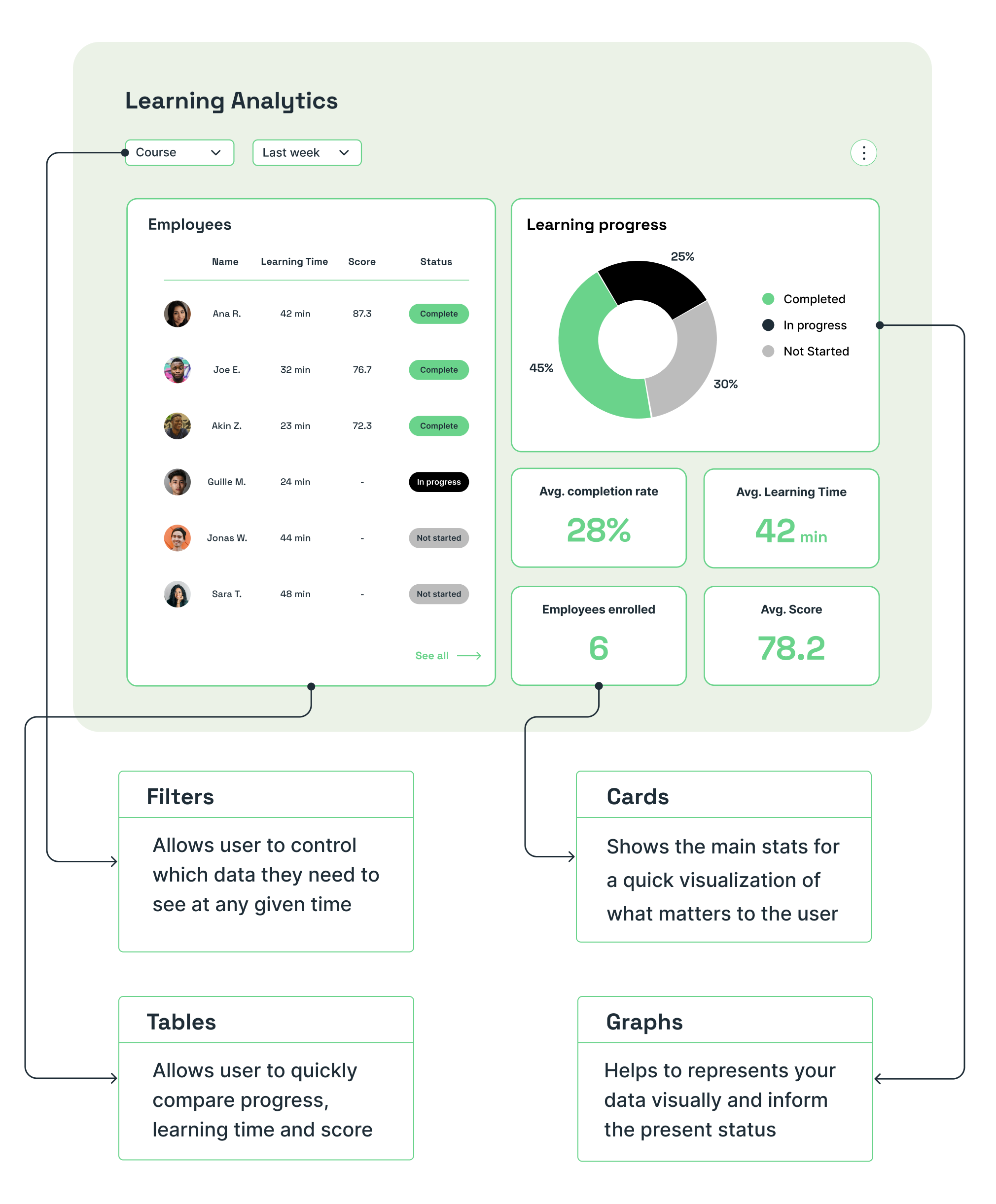 Our main goal was to keep the data visualization simple, consistent, intuitive and to give the user control to interact with it to complete their tasks on the platform.