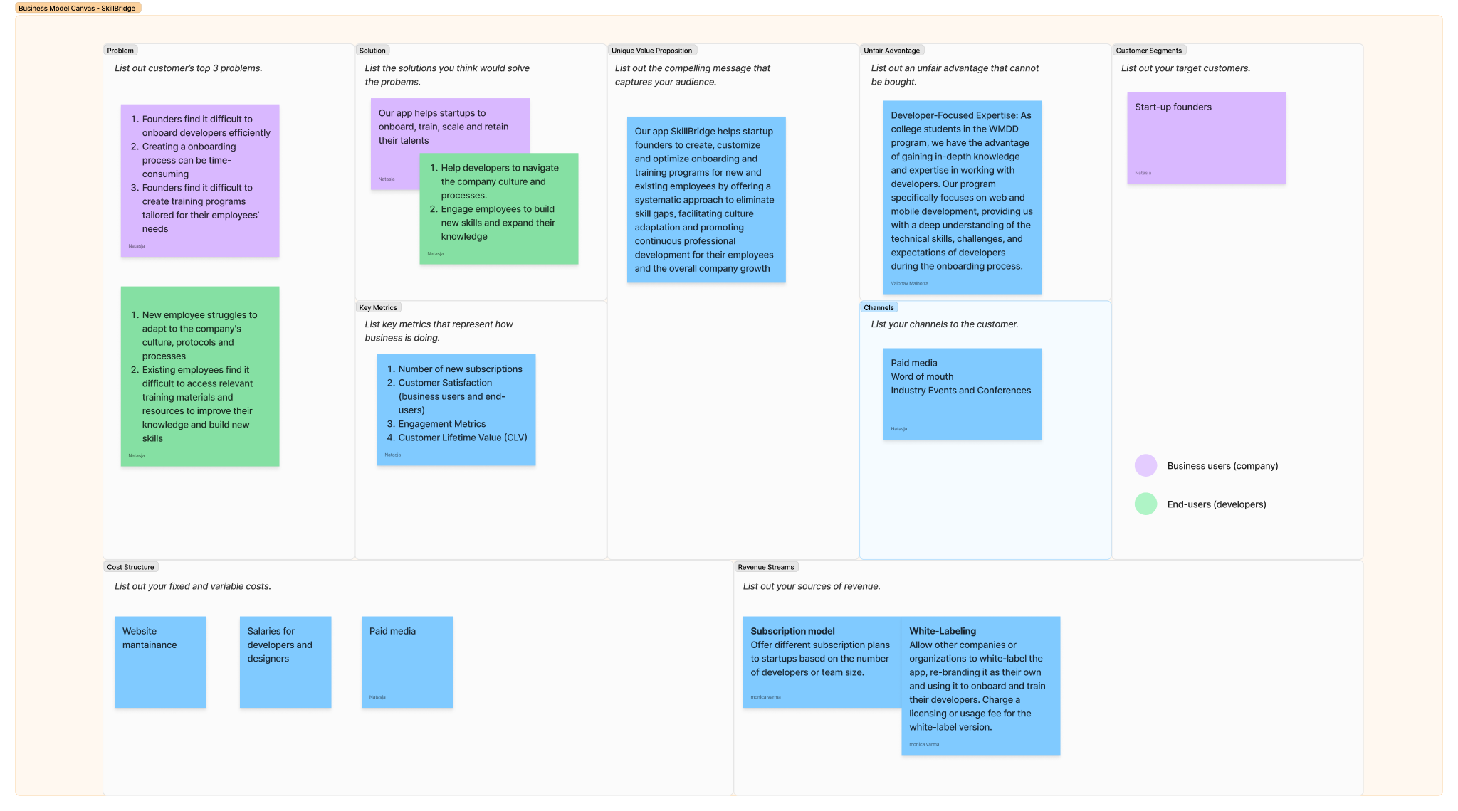 Creating the Lean Canvas for SkillBridge involved distilling our business idea into key components like customer segments, problem statements, value propositions, and revenue streams. We iteratively refined each section through brainstorming and research, using the canvas to guide decision-making, prioritize features, and stay aligned with our vision.